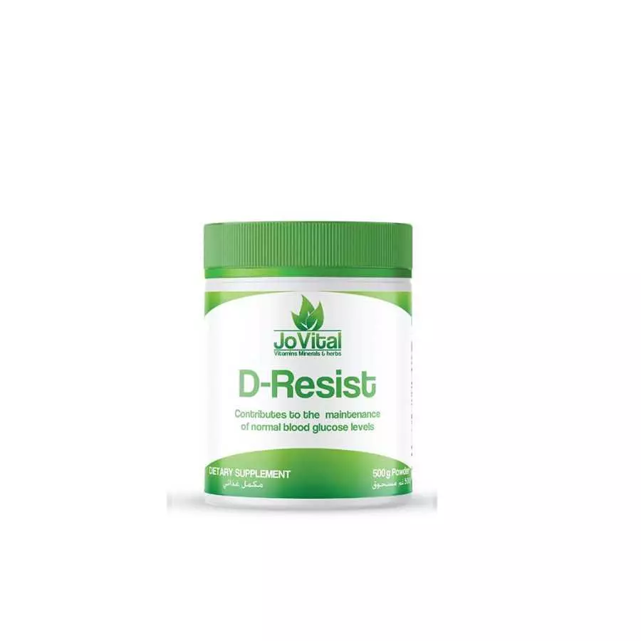 Jovital D-Resist Powder 500g is an innovative food supplement with a unique formula combining eight active ingredients that work together to regulate insulin levels and naturally control blood sugar. This product combines Apple Cider Vinegar Powder , Berberine , and Cinnamon Extract with Aloe Vera Plant , Spagula Fiber , Magnesium , Chromium , and Alpha Lipoic Acid , providing the body with comprehensive support to improve metabolism and enhance cellular insulin sensitivity. Additionally, this supplement helps reduce sugar cravings, control appetite, and improve daily energy levels. Jovital D-Resist Powder 500g supports digestive health through natural fiber and helps protect cells from oxidative stress thanks to the powerful antioxidants in its formula.